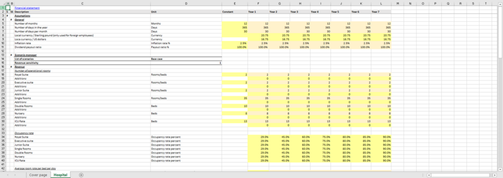 The Model includes all revenue streams that are generated by a Multi-Speciality Hospital, including all relevant metrics, like average lenght of stay, Hospital capacity and much more. It also includes all detailed expenses, which includes specifically stating the monthly salary of each employee (which includes the typically employed positions) and all other relevant expenses.